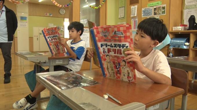 「ドリームスタディドリル」にはキングスの選手らが登場し、楽しみながら算数・社会・国語の3教科を学ぶことが出来ます。ドリルを受け取った子どもたちは早速ページをめくりながら学習への意欲を高めている様子でした。