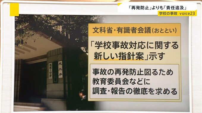 文部科学省は2月27日の有識者会議で「学校事故対応に関する新しい指針案」を示し、「事故の再発防止を図るため、教育委員会などに調査・報告の徹底を求める」ということです。