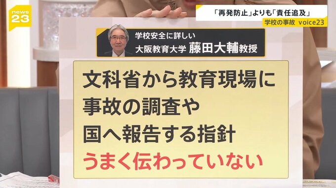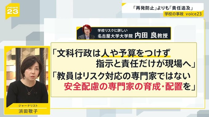 事故の再発防止につなげていきたいとしていますが、学校リスクに詳しい名古屋大学大学院の内田良教授によりますと、「文科行政は人や予算をつけず、指示と責任だけが現場に降りてくる状況」「教員はリスク対応の専門家ではない。安全配慮の専門家を育成して配置をしてほしい」と指摘しています。