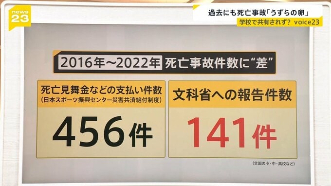 学校で死亡事故が起きた場合、児童・生徒のほとんどに独立行政法人から見舞金が支払われています。独立行政法人「日本スポーツ振興センター」の調査によると、7年間で456件の死亡事故があったということです。しかし、文科省に学校側から報告があった死亡事故は141件ということで同じ時期なのにかなり差があります。