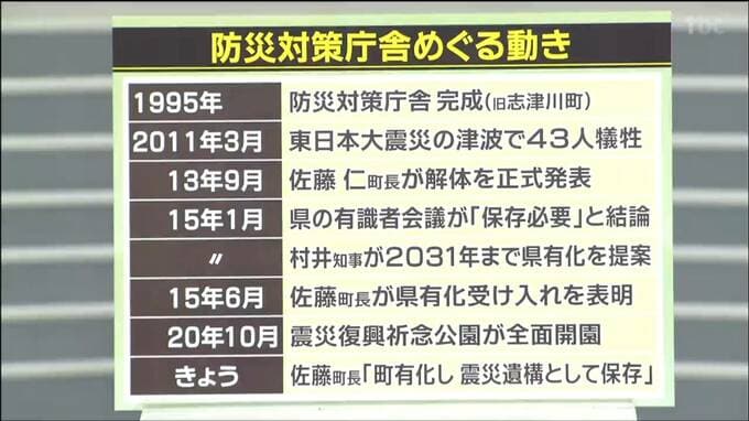 その後、保存か解体の議論が巻き起こるなか、2013年、佐藤仁町長が解体を正式発表します。これに対し、2015年1月、県の有識者会議が「保存すべき」との結論を出し、村井知事も2031年まで県が所有し管理することを提案します。これらを受けてその年の6月、佐藤町長は県有化を受け入れることを表明しました。その後、防災対策庁舎を含む一帯は南三陸町の震災復興祈念公園となります。そして、きょう佐藤町長が会見し防災対策庁舎の所有を県から町に戻し震災遺構としての保存を表明したというわけです。