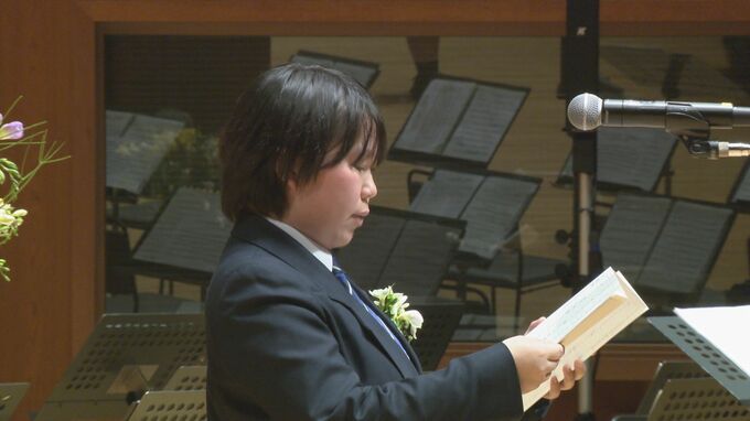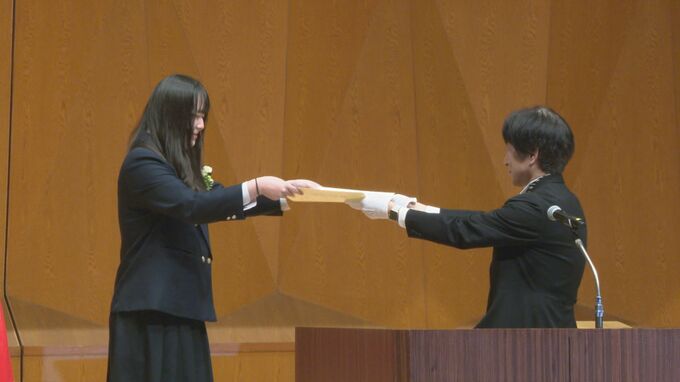 「先生方も大変な思いをされていたにも関わらず私たちのために学ぶ環境を用意して下さいましてありがとうございます。多くの思い出、学び、誇りを人生の糧とし共に力強く歩んでいきましょう」(答辞 村本咲菜さん)