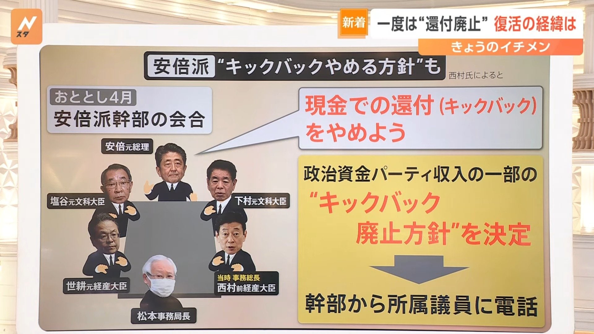 このときに、▼安倍元総理から「現金での還付(キックバック)をやめよう」という発言があったということなんです。そして、政治資金パーティー収入の一部の“キックバック廃止方針”が決定されたということで、幹部から所属議員に電話で連絡がありました。