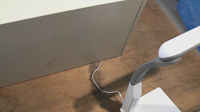 これは、火災への注意喚起のため、2月29日に公開された実験映像です。倒れたロッカーの下敷きになっているのはスタンド照明の「電源コード」。この状態でコードに電気が流れると。
