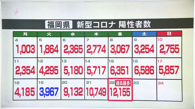 福岡県では22日、過去最多となる1万2155人の陽性が確認されました。3日連続で過去最多を更新しました。発表自治体別の内訳は、福岡市が5159人、北九州市が1753人、久留米市が752人、そのほ…