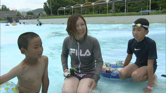 RKB黒木秀弥「照りつける太陽。こんな暑い日に入りたくなるのがプールですよね。こちらには、午前中からたくさんの家族連れが訪れています」