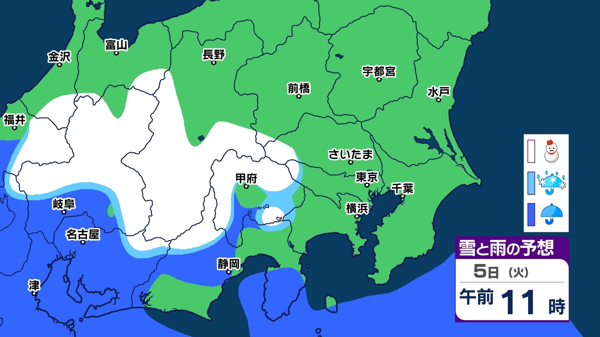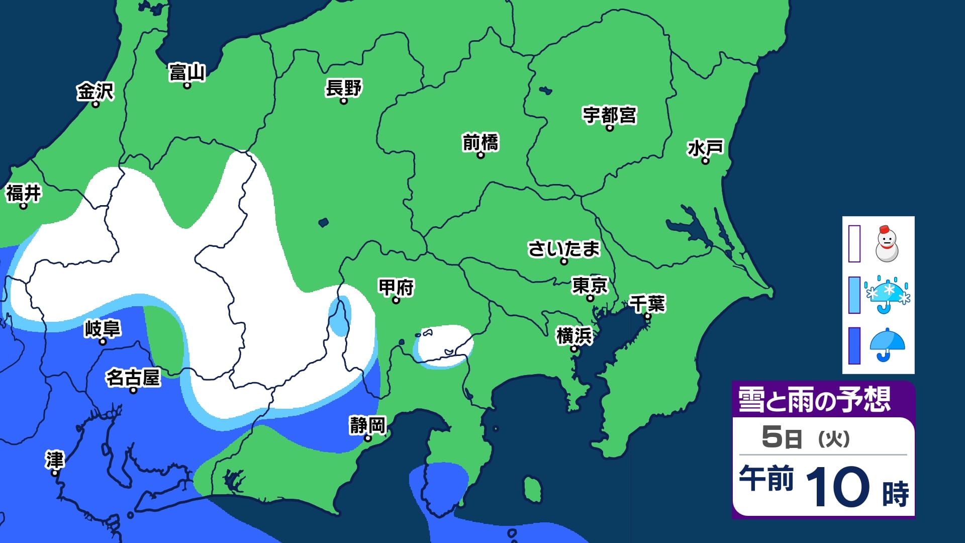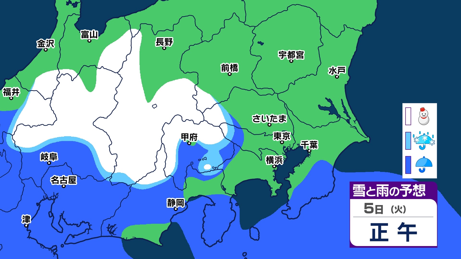 5日から6日にかけて、前線を伴った低気圧が本州の南岸を発達しながら東北東へ進むため、関東甲信地方では、5日昼過ぎから6日にかけて、雨や雪が降る見込みです。山沿いや山地を中心に雪となり、大雪となる所があるでしょう。