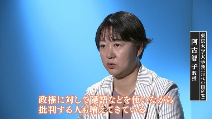 東京大学大学院・阿古智子教授(現代中国研究)「政権に対し隠語とか使いながら批判する人にも圧力がかかって、どんどん 削除されていく。監視が進んでいる。ですから息を抜くことができない。疑問とかも、発信することができなくなってしまっている」