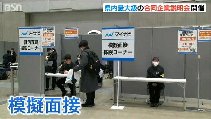 3日と4日の2日間、朱鷺メッセで開かれている「マイナビ就職EXPO」。3日は、県内外から116の企業が集まり、参加した学生に会社の魅力や仕事内容などを説明していました。会場には模擬面接を体験できるコーナーなども用意されていて、学生は真剣に話を聞いていました。