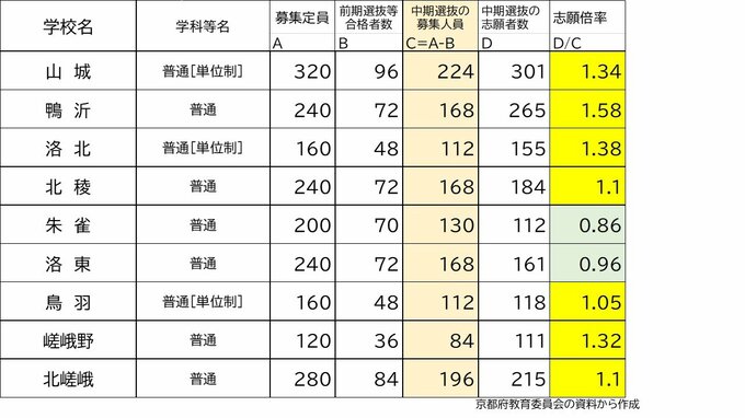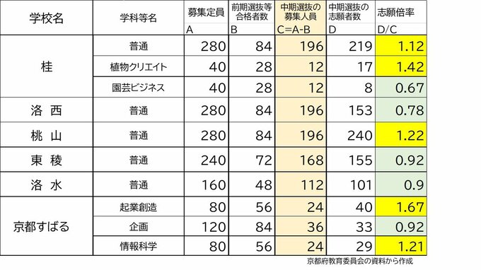 【確定値】京都府公立高校入試2024 京都すばる1.67倍、堀川1.13倍、嵯峨野1.32倍、鴨沂1.58倍(令和6年度高校受験 中期選抜全日制の全校掲載) 毎日放送 2024年3月4日(月) 14:33 国内 学校別の志願倍率 山城1.34倍 洛北1.38倍