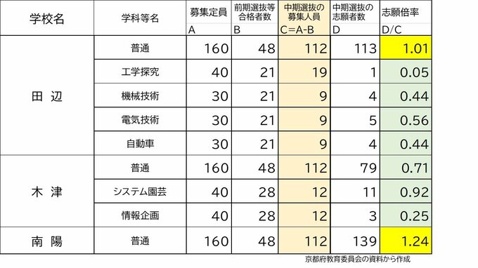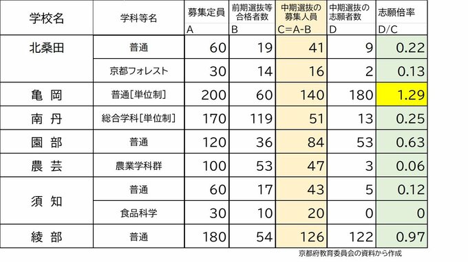 【確定値】京都府公立高校入試2024 京都すばる1.67倍、堀川1.13倍、嵯峨野1.32倍、鴨沂1.58倍(令和6年度高校受験 中期選抜全日制の全校掲載) 毎日放送 2024年3月4日(月) 14:33 国内 学校別の志願倍率 南陽1.24倍 亀岡1.29倍