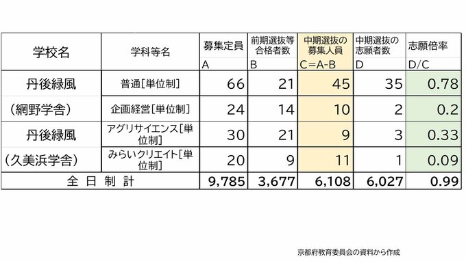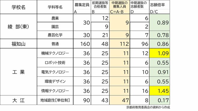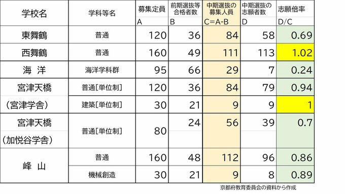 【確定値】京都府公立高校入試2024 京都すばる1.67倍、堀川1.13倍、嵯峨野1.32倍、鴨沂1.58倍(令和6年度高校受験 中期選抜全日制の全校掲載) 毎日放送 2024年3月4日(月) 14:33 国内 学校別の志願倍率 福知山0.86倍 西舞鶴1.02倍