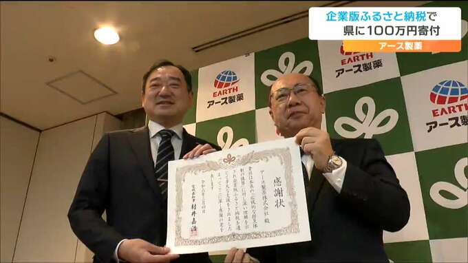 アース製薬は2022年、宮城県と包括連携協定を結び災害時の被災者支援の取り組みを進めていて今回は「企業版ふるさと納税」を活用し県に100万円を寄付しました。寄付金は全額、県の防災態勢の構築に活用されます。