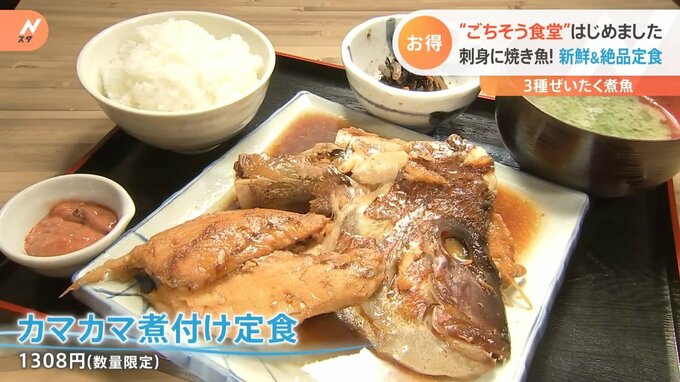 お盆を埋めつくす魚の煮付け。「カマカマ煮つけ定食」(1308円)※数量限定