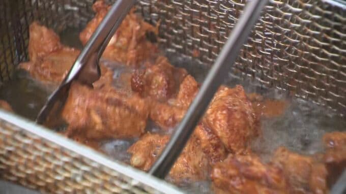 輪島市河井町の重蔵神社で行われた炊き出し。住民たちが長い列を作る先で作られていたのは、あつあつ、ジューシーな唐揚げに…
