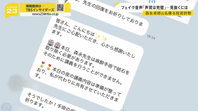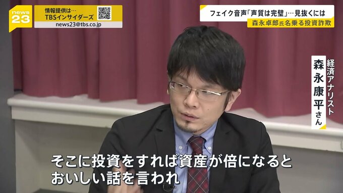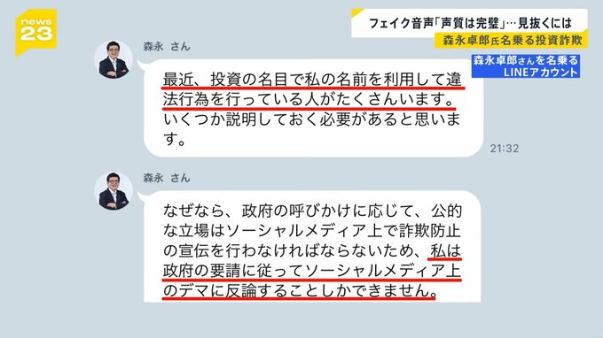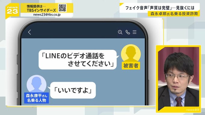 「私が被害報告を受けたケースですと、(被害者が)偽の森永康平とやりとりしていて、LINEのビデオ通話をさせてくださいというふうに送ったら、『いいですよ』と返信が来て、実際にビデオ通話できたそうです。いわゆる“ディープフェイク”というやつ」
