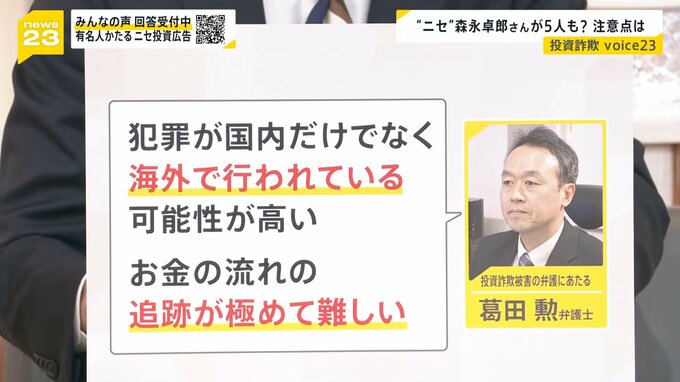 東京投資被害弁護士研究会の葛田勲 弁護士は、「犯罪が国内だけでなく、海外で行われている可能性が高い。お金の流れの追跡が極めて難しい」と話しています。