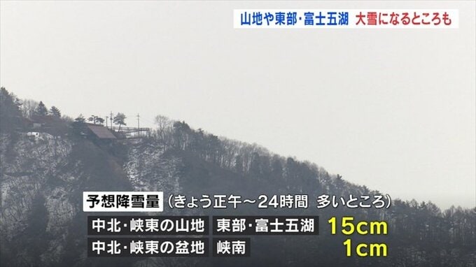 甲府地方気象台によりますと5日正午から予想される24時間降雪量はいずれも多いところで中北と峡東の山地、東部、富士五湖で15㎝、中北や峡東の盆地、峡南で1㎝となっています。