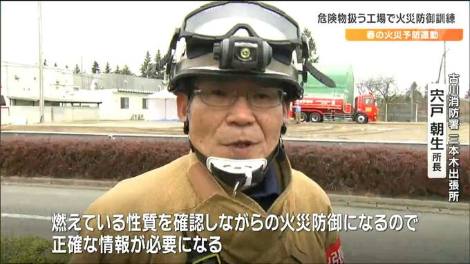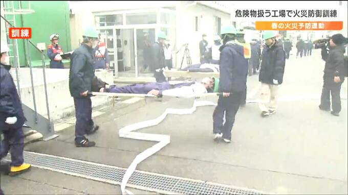 春の火災予防運動にあわせ、危険物を扱っている宮城県大崎市の工場で火災防御訓練が行われ、消防や従業員らが初動態勢や有毒ガスの除去作業の仕方を確認しました。