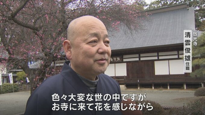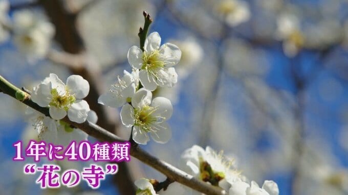 1年を通して40種類の花が楽しめる花の寺で、春の訪れを真っ先に知らせるウメの花がいま見ごろとなっています。