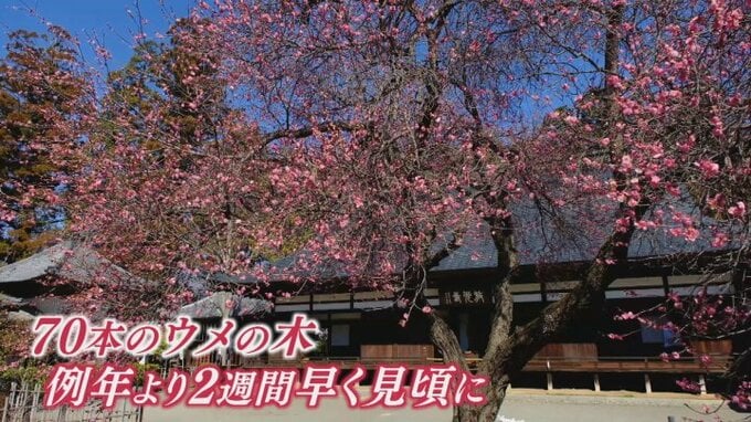 境内には70本のウメの木が植えられていて、今年は暖冬の影響で例年より2週間早く見頃となりました。