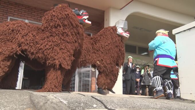 戦時中の中断を挟みながら111年続く伝統の祭りが始まると、クロツグの葉を頭に巻いた住民らが2頭の獅子を先頭にホラ貝や鉦を鳴らしながら、施設周辺を払い清めました。
