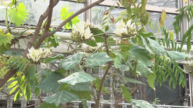 白い花を咲かせる珍しいデイゴの花が、本部町の海洋博公園で見ごろを迎えています。