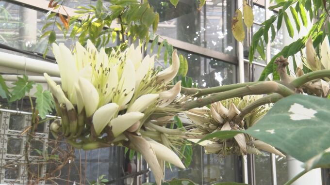 赤花のデイゴよりも少し早い2月から3月が見ごろだということで、今月中旬ごろまで、熱帯ドリームセンターのビクトリア温室で淡い白色の花を鑑賞することができます。