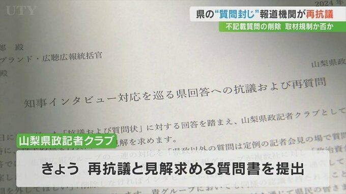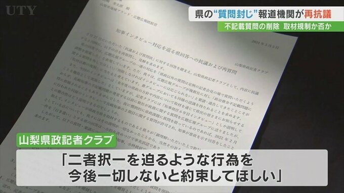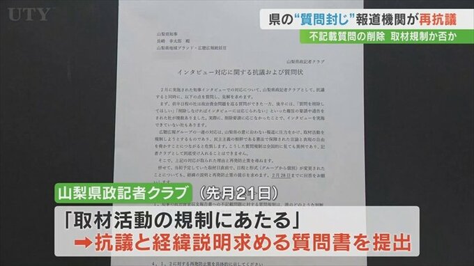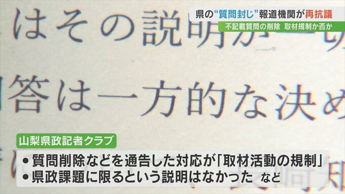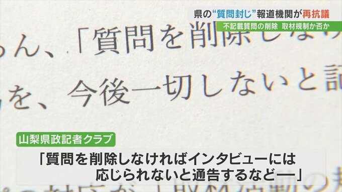 これに対して県内の報道機関14社が加盟する山梨県政記者クラブは2月21日「取材活動の規制にあたる」として県側に抗議といきさつの説明を求める質問書を提出しました。