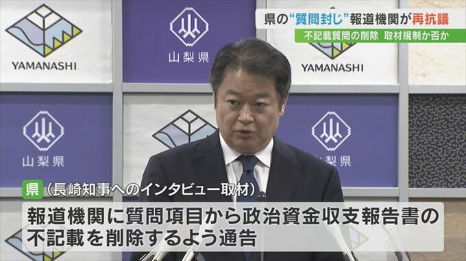 山梨県の長崎幸太郎知事へのインタビュー取材を巡り、県側が複数の報道機関に収支報告書の不記載に関する質問の削除などを求めた問題です。