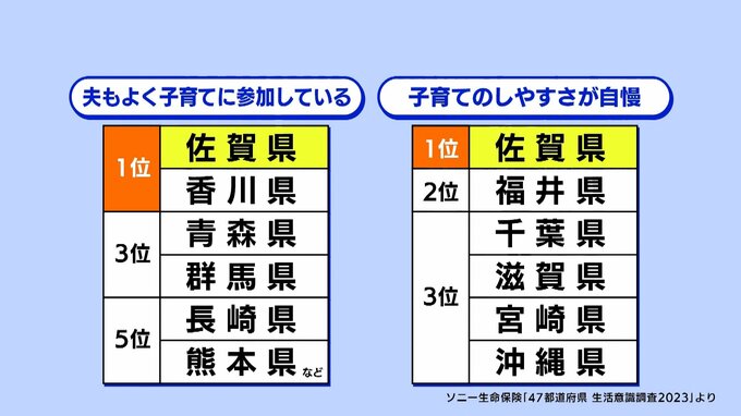 ソニー生命保険が去年11月に、20歳~59歳の男女を対象に行なったアンケート調査では、佐賀県が「夫もよく育児に参加している(いた)」「『子育てのしやすさ』が自慢」と答えた人の割合が最も多く、全国1位でした。その理由はどこにあるのでしょうか。