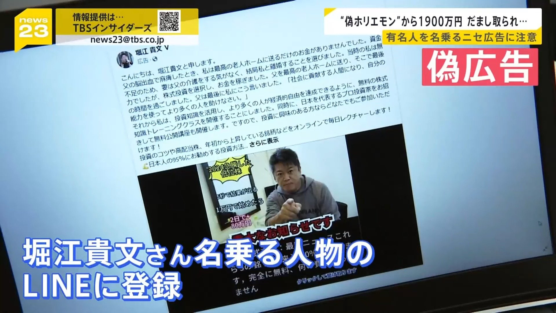 「フェイスブックで、堀江貴文さんをかたる広告を見ました。上がる株を教えますという」
