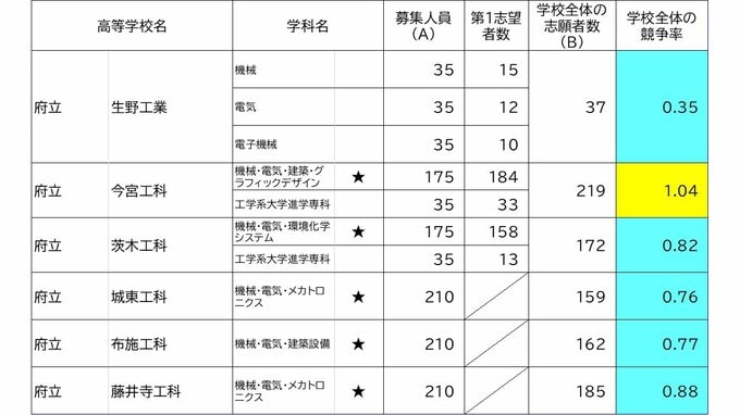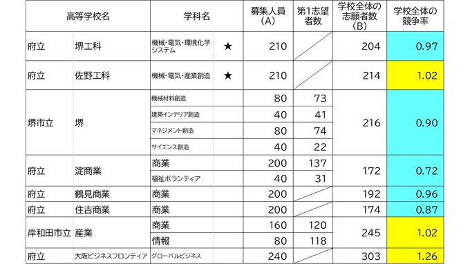 【確定値】大阪府公立高校入試2024 志願倍率は北野1.28倍 豊中1.57倍 三国丘1.47倍(令和6年度高校受験の出願締め切り 全校掲載) 毎日放送 2024年3月7日(木) 20:56 国内 学校別の倍率(確定値) 今宮工科1.04倍 大阪ビジネスフロンティア1.26倍