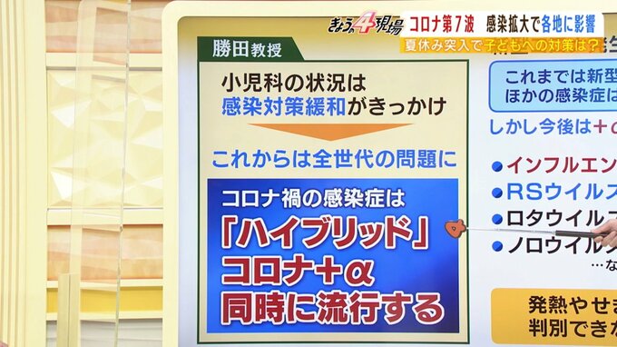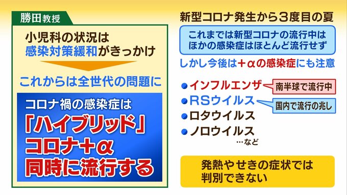 「実は今小児科の外来で起こっていること、RSウイルスや感染性の胃腸炎やノロなど様々なものがあります。ですのでそういったものがこれまでの感染対策いわゆるあらゆるウイルスをシャットアウトしていたというところから色々な門戸が開いて入ってくるわけですね。そういう意味合いでつまりコロナプラスアルファまさに『ハイブリッド』という状況がこれから考えられるわけですね」