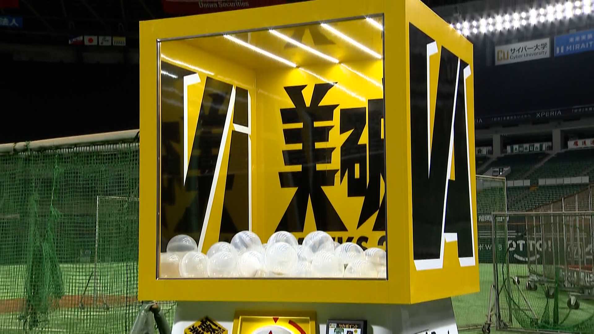 RKB宮脇憲一「すごいです! PayPayドームのグラウンドに、これほどの高さのガチャガチャが誕生しています。高さが2.5メートル。スタンドの高さとほぼ同じくらいまでそびえ立っているんですよね」