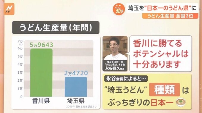 埼玉は隠れた“うどん県”だといいます。2009年のうどんの年間の生産量は、香川が日本で一番多く、2位が埼玉でした。