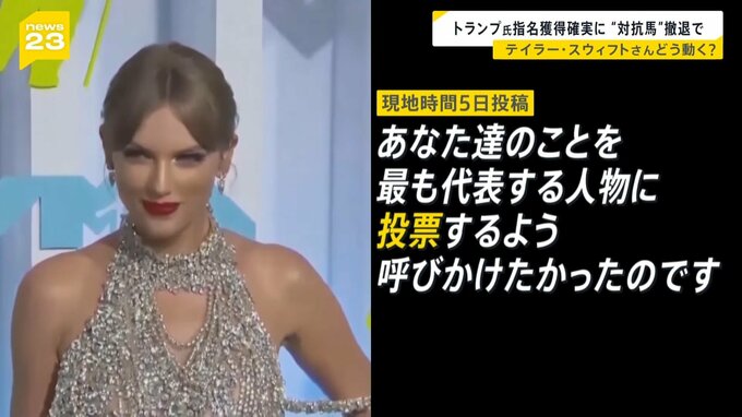 アメリカ大統領選に向けた共和党の候補者レース。トランプ前大統領の最後の対抗馬ヘイリー元国連大使が撤退を表明すると報じられました。ヘイリー氏が撤退すれば、トランプ氏が共和党の候補者に指名されることは確実。11月の大統領選に向け若者に絶大な影響力を持つ歌手テイラー・スウィフトさんの動きにも関心が集まっています。