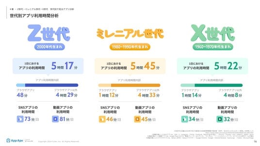 アプリユーザーを「Z世代(2000年代生まれ)・ミレニアル世代(1980年~90年代生まれ)・X世代(1960年~1970年代生まれ)」の3世代に区分。1日におけるアプリの利用時間・SNSアプリの利用時間・動画アプリの利用時間の3つの指標について取りまとめ、世代間の差異を浮き彫りにしました。