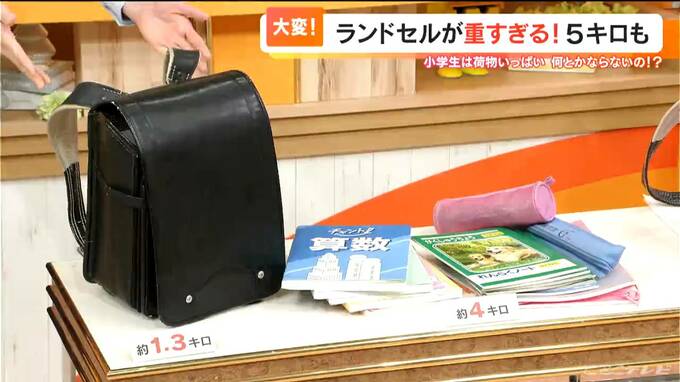 今回は、CBCテレビスタッフの自宅にあったランドセルをスタジオに用意しました。このランドセルだけでも重さは1.3キロでした。そして、子供たちにとっても大変なのが、中身なんです。