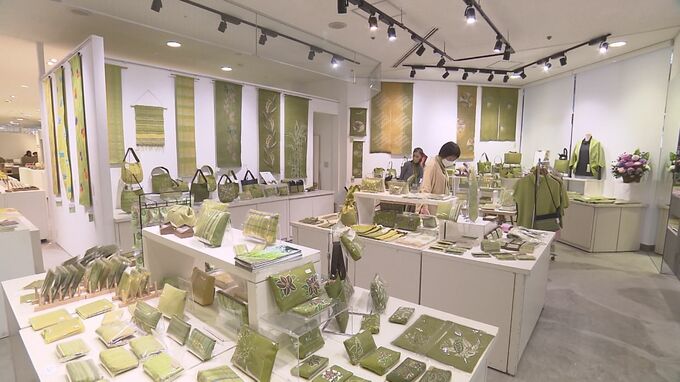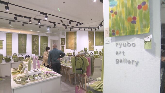 サトウキビの葉や穂を煮出して、布や糸を染めた「ウージ染め」の展示会が那覇市ではじまり、緑や薄桃色のさわやかな作品が春の訪れを告げています。