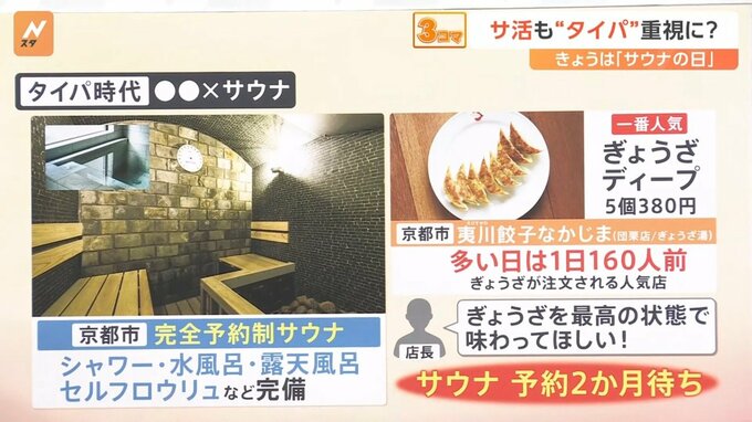 こちら、京都市にある「夷川餃子なかじま」は、多い日で1日160人前の餃子が注文される人気店でしたが、店長が「餃子を最高の状態で味わってほしい!」とサウナを設置。サウナで整った後は五感が研ぎ澄まされて、味覚も敏感になっているので、ご飯がより美味しく感じるそう。今や大人気で、サウナの予約は2か月待ちということでした。