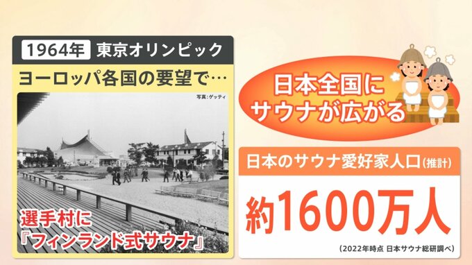 いつ日本にサウナが広まったのかというと、1964年東京オリンピックのときです。ヨーロッパ各国からの要望で、選手村に「フィンランド式サウナ」が設置されました。その後、日本全国にサウナが広がり、今では日本のサウナ愛好家人口は約1600万人と言われています。