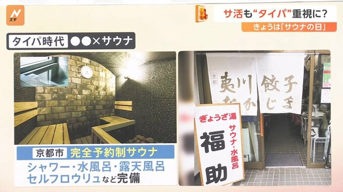 効率的な時間の使い方“タイパ”を重視する人が増えてきているということで、こんなものとサウナを掛け合わせています。それが“餃子店でサウナが楽しめる”というもの。店の奥には完全予約制のサウナがあり、シャワーや水風呂、露天風呂、セルフロウリュなど完備しています。