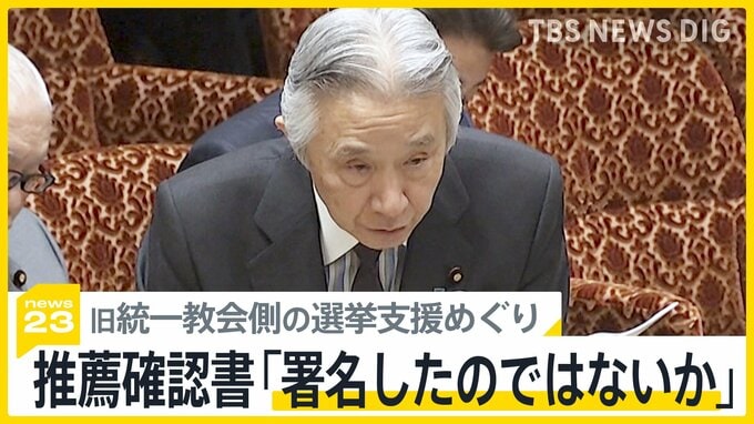 旧統一教会の関連団体から選挙支援を受けたとされる問題をめぐり、推薦確認書への署名について「記憶にない」と繰り返してきた盛山正仁文科大臣が「記憶にないが、署名したのではないか」と答弁しました。立憲・杉…