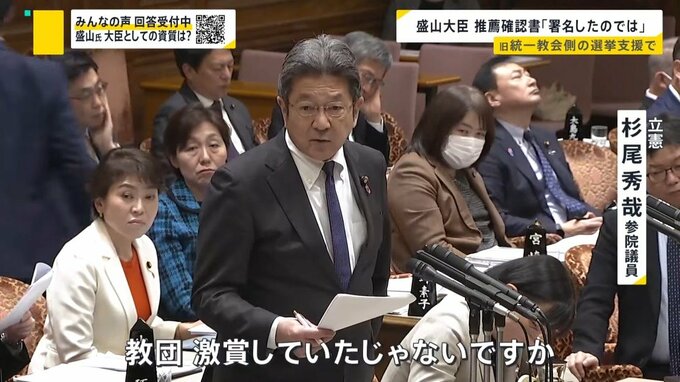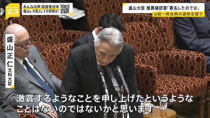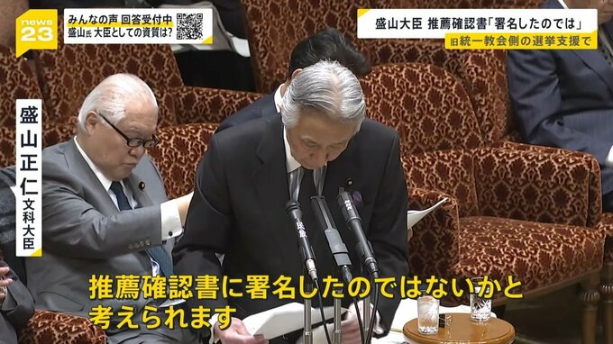 旧統一教会の関連団体から選挙支援を受けたとされる問題をめぐり、推薦確認書への署名について「記憶にない」と繰り返してきた盛山正仁文科大臣が「記憶にないが、署名したのではないか」と答弁しました。