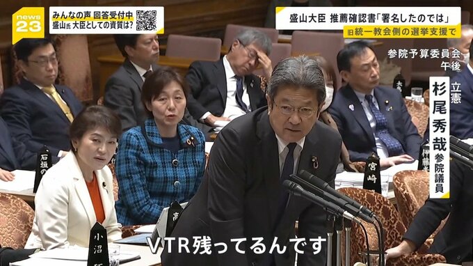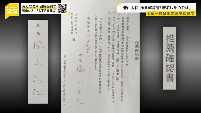 盛山大臣は2021年の衆院選の際に、事実上の政策協定にあたる推薦確認書にサインしたのではとの疑惑も持たれていて、TBSが2024年3月6日までに入手した推薦確認書には「盛山正仁」と署名が入っています。