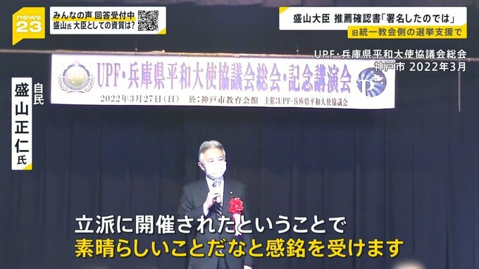 盛山大臣は明言を避けたうえで、現在は旧統一教会との関係は断っていて、公正・厳正に対応していると強調しました。