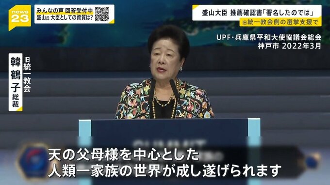 「韓鶴子総裁の演説映像を見た後、感銘を受けたと。教団、激賞していたじゃないですか」
