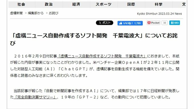 UK氏:去年3月に「虚構ニュースを自動作成するソフト開発 千葉電波大」という記事について検証と謝罪の記事を出しました。元記事は2016年に掲載したのですが、当時のAIはまだ初歩的な段階だったので、自然な創作文を自動生成する技術は30年とか50年後になると予想していたんです。「仮に実現したとしても、その頃にはもう虚構新聞も無いから謝ることもないだろう」と。
