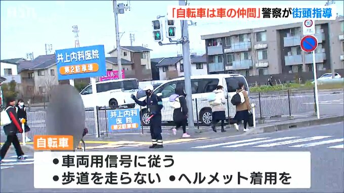 1日から始まった交通事故防止運動の一環で警察が新潟市 中央区の交差点で自転車に乗る人に安全な利用を呼びかけました。